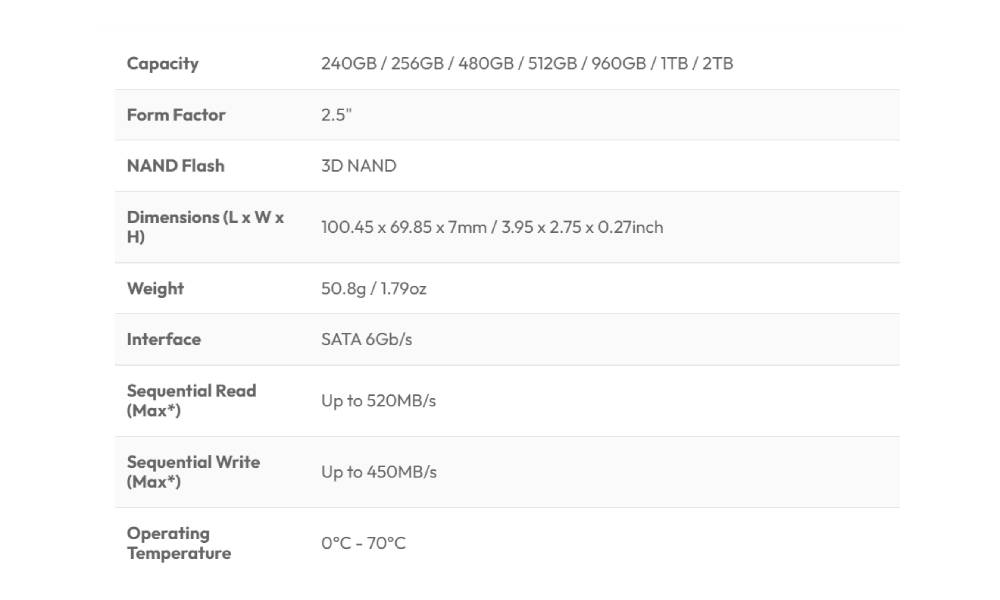 ด้วย 3D NAND Flash SU650 จึงมีประสิทธิภาพที่สูงขึ้นและความน่าเชื่อถือที่เพิ่มขึ้นเมื่อเปรียบเทียบกับ 2D NAND SSD พร้อมด้วยอัตราส่วนต้นทุนต่อประสิทธิภาพที่ได้รับการปรับปรุง