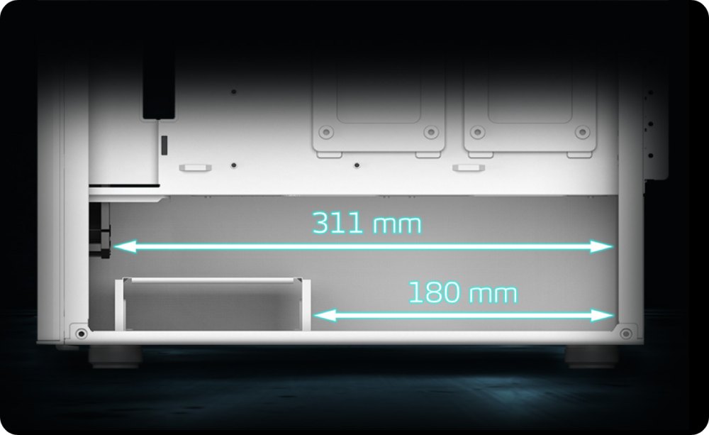 แม้ว่าจะเหมาะอย่างยิ่งสำหรับ PSU รุ่นใหม่และขนาดกะทัดรัดจาก XPG เช่น XPG CORE REACTOR และ XPG CYBERCORE ที่ได้รับรางวัล โดยมีความยาว 140 มม. และ 160 มม. ตามลำดับ แต่การออกแบบเคส ATX แบบกะทัดรัดของ VALOR AIR ก็ยังช่วยให้สอด PSU ที่มีความยาวสูงสุด 180 มม. เข้าไปได้อย่างง่ายดาย ซึ่งหมายความว่ายังมีพื้นที่เหลืออีกมากสำหรับการจัดการสายเคเบิล นอกจากนี้ยังมีล็อคฐานยึด HDD/SSD ยังสามารถถอดออกได้ ช่วยให้มีพื้นที่เพิ่มเติมได้ถึง 311 มม.