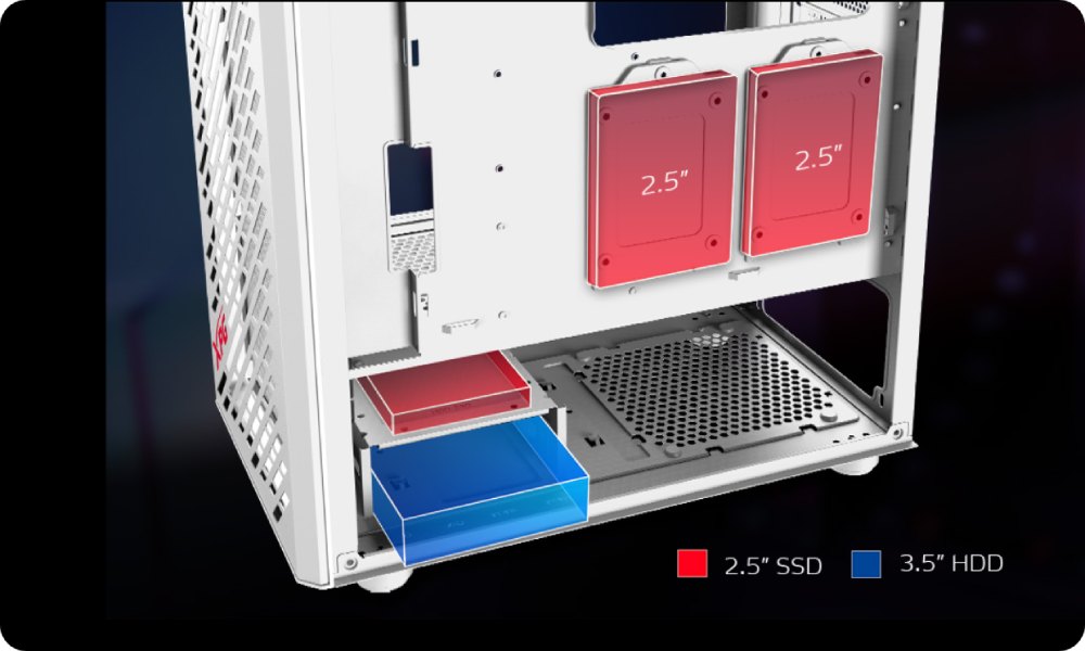 ผู้ใช้ยังสามารถติดตั้ง HDD cage เพื่อเพิ่มไดรฟ์ขนาด 3.5 นิ้วได้สองไดรฟ์ หรือไดรฟ์ขนาด 2.5 นิ้ว + 3.5 นิ้ว ใต้ด้านหน้าของฝาครอบ PSU ได้อีกด้วย HDD cage นี้มาพร้อมกับอุปกรณ์เสริมเมื่อแกะกล่อง XPG VALOR AIR ซึ่งเป็นตัวเลือกที่ยืดหยุ่นให้ผู้ใช้เลือกได้เมื่อติดตั้งอุปกรณ์จัดเก็บข้อมูล