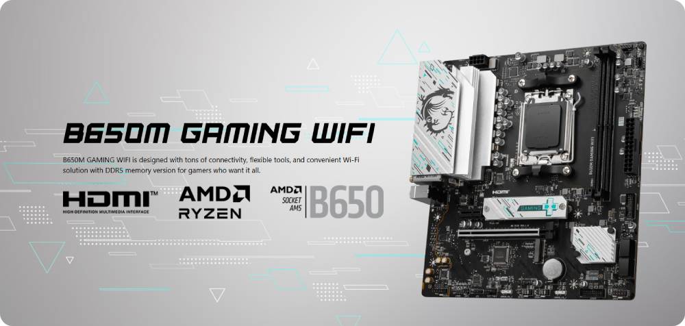เมนบอร์ด B650M GAMING WIFI ได้รับการออกแบบมาพร้อมการเชื่อมต่อมากมาย เครื่องมือที่ยืดหยุ่น และโซลูชั่น Wi-Fi ที่สะดวกสบายพร้อมหน่วยความจำเวอร์ชัน DDR5 สำหรับเกมเมอร์ที่ต้องการทุกสิ่งทุกอย่าง