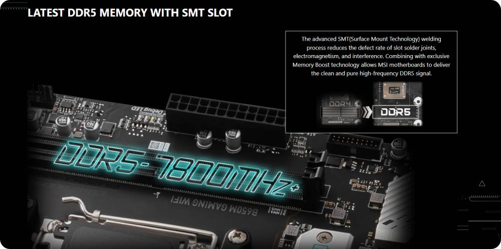 ก้าวสำคัญในการเพิ่มประสิทธิภาพ DDR ด้วยหน่วยความจำ DDR5 รุ่นล่าสุด ผสานกับกระบวนการเชื่อม SMT เฉพาะและเทคโนโลยี MSI Memory Boost ทำให้ B650M GAMING WIFI พร้อมที่จะมอบประสิทธิภาพหน่วยความจำระดับโลก