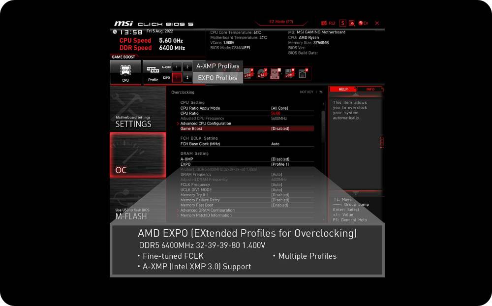 MSI ดำเนินการทดสอบหน่วยความจำอย่างละเอียดกับแบรนด์หน่วยความจำยอดนิยมภายใต้สภาวะที่รุนแรงเพื่อให้แน่ใจว่าระบบของคุณทำงานได้เสถียรไม่ว่าจะเกิดอะไรขึ้นก็ตาม เปิดใช้งานโปรไฟล์ EXPO ได้ง่ายด้วยการตั้งค่าพลังงานอัตโนมัติเพื่อให้ได้ความเร็วและความเสถียรของหน่วยความจำที่ดีที่สุด