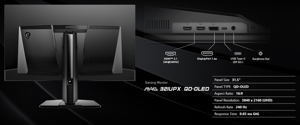 • Connectors : 2x HDMI Port 2.1 (4K@240Hz), 1x Display Port 1.4a, USB-C, Earphone Out