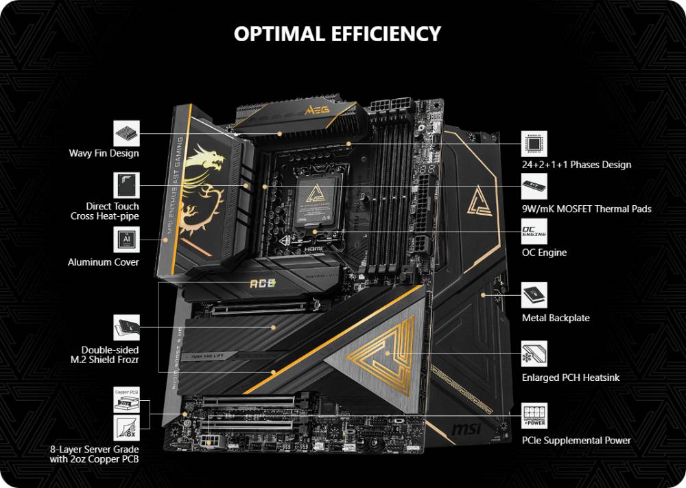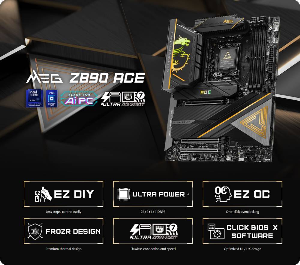 เมนบอร์ด MSI MEG Z890 ACE รูปลักษณ์พรีเมียมพร้อมการเคลือบสีดำเข้มและสีทองอ่อน MEG Z890 ACE ได้รับการพัฒนาขึ้นเพื่อปลดล็อกศักยภาพการเล่นเกมทั้งหมดของโปรเซสเซอร์ Intel Core Ultra โดยผสมผสานการรองรับระบบฮาร์ดแวร์ชั้นยอดและความทนทานระดับพรีเมียม จึงเป็นแพลตฟอร์ม ATX ของ Z890 ที่ยอดเยี่ยมสำหรับการตั้งค่าสุดขั้วในแง่ของการโอเวอร์คล็อกโปรเซสเซอร์ หน่วยความจำ DDR5 และการ์ดกราฟิกในระดับสูงสุด