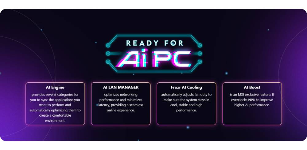 เมนบอร์ด MSI ได้รับการออกแบบด้วยฮาร์ดแวร์และเทคโนโลยีขั้นสูง รองรับการใช้งานคอมพิวเตอร์ที่ต้องใช้ทรัพยากรสูงในการเล่นเกมและ AI นอกจากนี้ เรายังนำ AI เข้ามาใช้ใน MSI Center และ BIOS ทำให้ทุกอย่างง่ายดายยิ่งขึ้นกว่าเดิม