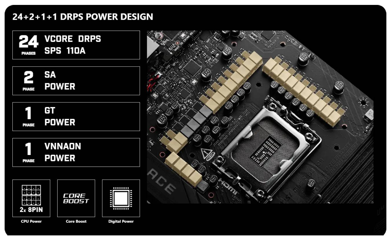 - ประสิทธิภาพพิเศษ: ระบบจ่ายไฟ Duet Rail 24+2+1+1, SPS 110A, OC Engine, ขั้วต่อไฟ CPU 2x 8-pin, Core Boost, Memory Boost, PCB 8 ชั้นที่ผลิตจากทองแดงหนา 2 ออนซ์และวัสดุระดับเซิร์ฟเวอร์