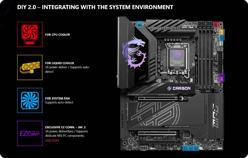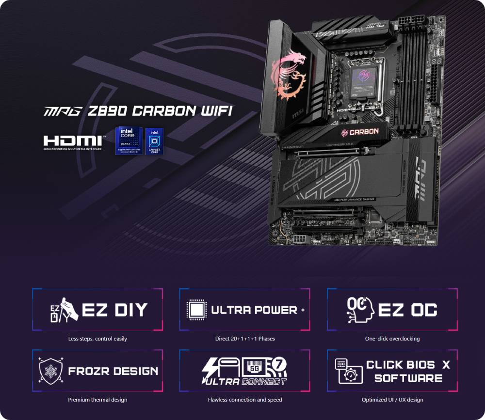 เมนบอร์ด MSI MPG Z890 CARBON WIFI ใช้โทนสีคาร์บอนแบล็คและลวดลายที่มีสไตล์บนแสงไฟ Mystic light RGB เพื่อแสดงถึงเอกลักษณ์ที่แตกต่าง นอกจากนี้ยังทรงพลังภายในด้วย Killer 5G LAN และโซลูชัน Wi-Fi 7, Thunderbolt 4, Supplemental PCIe Power และการออกแบบ EZ DIY ที่ง่ายดาย ทำให้มาเธอร์บอร์ดนี้เป็นหนึ่งในมาเธอร์บอร์ด Z890 ATX ที่ดีที่สุดสำหรับโปรเซสเซอร์ Intel Core Ultra อย่างแน่นอน