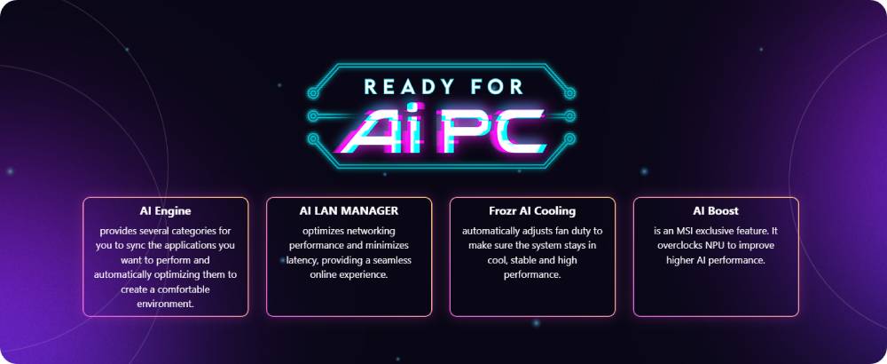 เมนบอร์ด MSI ได้รับการออกแบบด้วยฮาร์ดแวร์และเทคโนโลยีขั้นสูง รองรับการใช้งานคอมพิวเตอร์ที่ต้องใช้ทรัพยากรสูงในการเล่นเกมและ AI นอกจากนี้ เรายังนำ AI เข้ามาใช้ใน MSI Center และ BIOS ทำให้ทุกอย่างง่ายดายยิ่งขึ้นกว่าเดิม