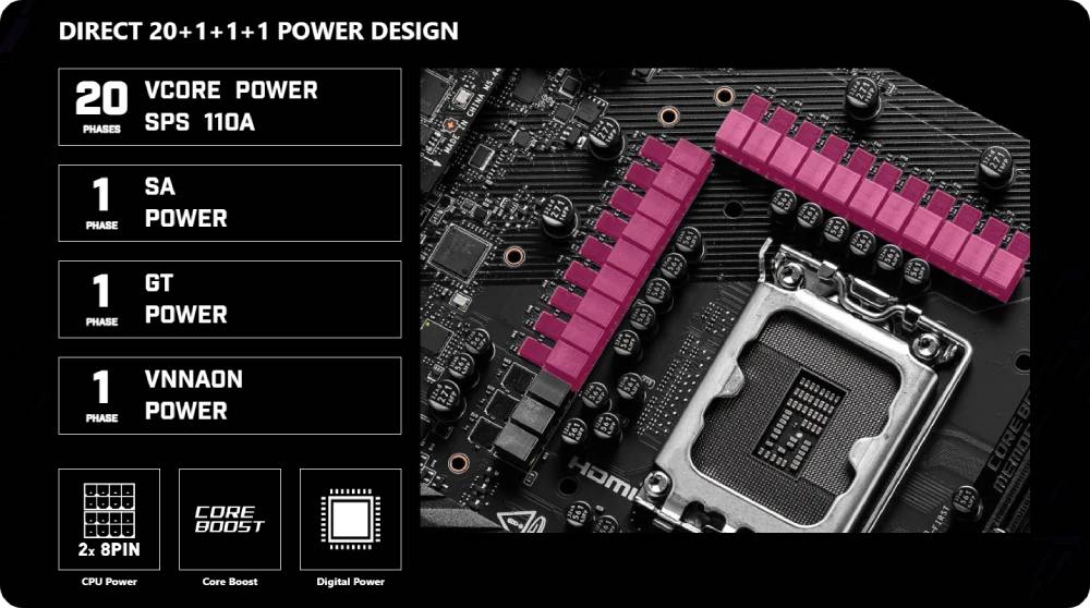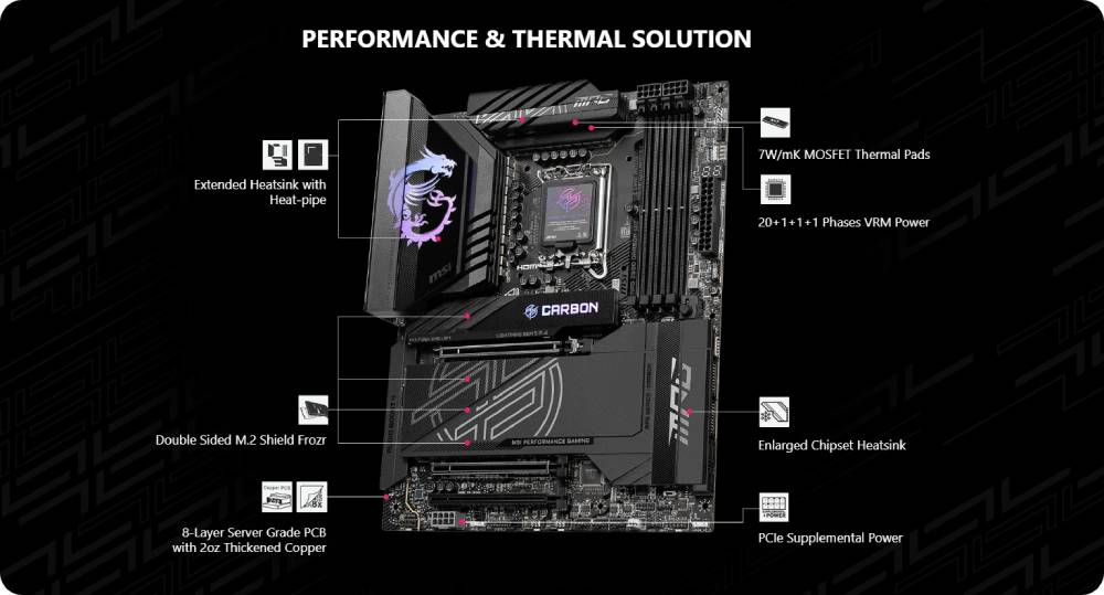 ปลดปล่อยและรักษาประสิทธิภาพสูงสุดด้วยดีไซน์ระดับเรือธง VRM ที่สร้างขึ้นด้วยเฟสจ่ายไฟโดยตรง 20+1+1+1 ทั้งหมด MPG Z890 CARBON WIFI ผสานขั้วต่อไฟฟ้าคู่และ Smart Power Stage 110A พร้อมรับมือกับความท้าทายของโปรเซสเซอร์ระดับไฮเอนด์