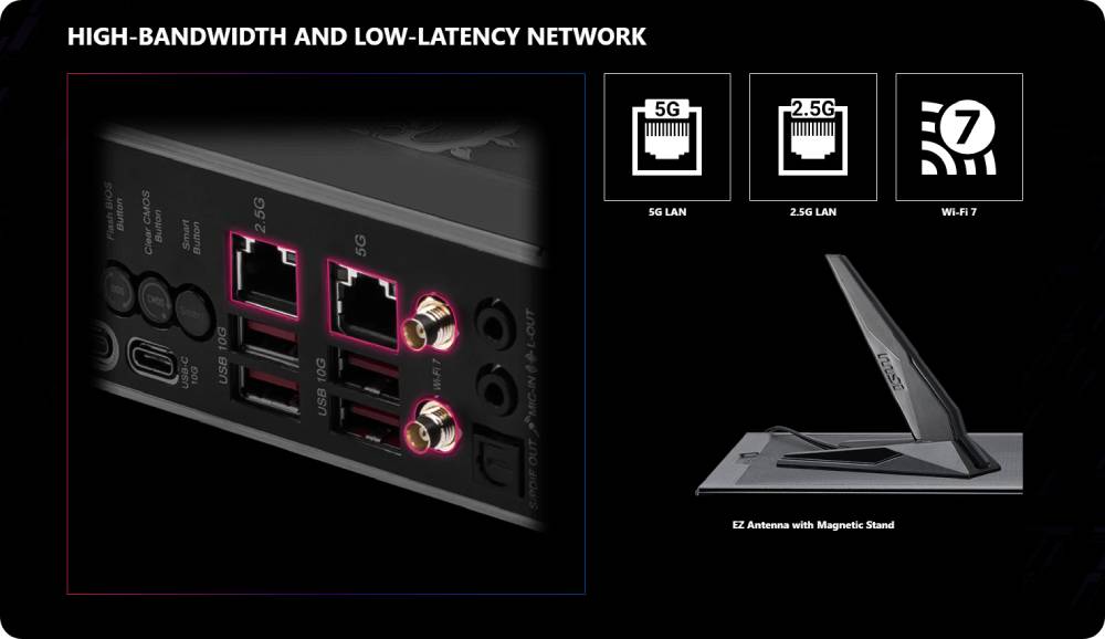 - Onboard LAN Chipset: 1x Intel I226V 2.5G LAN, 1x Intel Killer E5000B 5G LAN, Intel Killer BE1750x Wi-Fi 7, Bluetooth v5.4