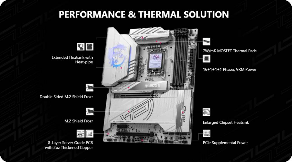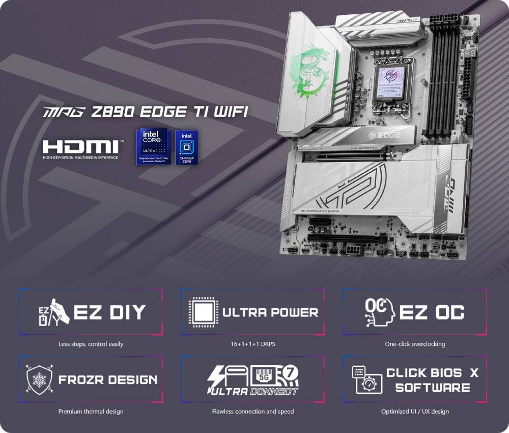 เมนบอร์ด MSI MPG Z890 EDGE TI WIFI มาพร้อมกับโทนสีเงินขาวเพื่อให้ผู้ที่ชื่นชอบการประกอบพีซีสีขาวได้แสดงออกถึงตัวตนที่แตกต่าง อีกทั้งยังทรงพลังด้วยโซลูชัน Killer Wi-Fi 7 และ 5G LAN, Thunderbolt 4 และความเข้ากันได้กับ PCIe 5.0 ล่าสุด, Supplemental PCIe Power และนี่คือเมนบอร์ด Z890 ATX ธีมสีขาวที่ดีที่สุดสำหรับโปรเซสเซอร์ Intel Core Ultra