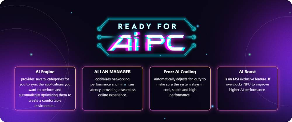 เมนบอร์ด MSI ได้รับการออกแบบด้วยฮาร์ดแวร์และเทคโนโลยีขั้นสูง รองรับการใช้งานคอมพิวเตอร์ที่ต้องใช้ทรัพยากรสูงในการเล่นเกมและ AI นอกจากนี้ เรายังนำ AI เข้ามาใช้ใน MSI Center และ BIOS ทำให้ทุกอย่างง่ายดายยิ่งขึ้นกว่าเดิม