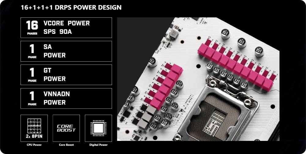 - ประสิทธิภาพระดับสูงสุด: ระบบจ่ายไฟ Duet Rail 16+1+1+1, ขั้วต่อจ่ายไฟ CPU Dual 8-pin, Core Boost, Memory Boost, PCB 8 ชั้นที่ผลิตจากทองแดงหนา 2 ออนซ์และวัสดุระดับเซิร์ฟเวอร์