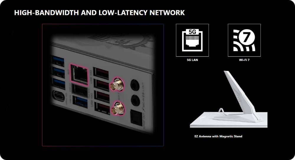 - Onboard LAN Chipset: Intel Killer E5000B 5G LAN, Intel Killer BE1750x Wi-Fi 7, Bluetooth v5.4