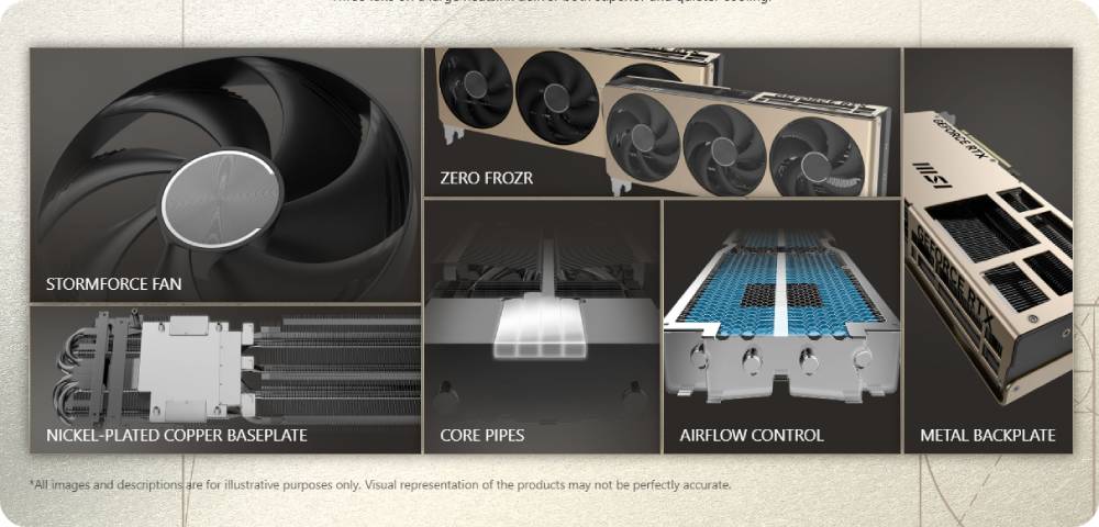- Nickel-plated Copper Baseplate: ความร้อนจาก GPU และหน่วยความจำจะถูกจับและถ่ายโอนอย่างรวดเร็วโดยแผ่นฐานทองแดงชุบนิกเกิล