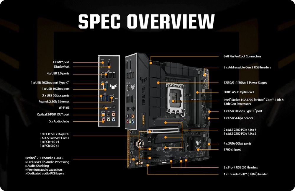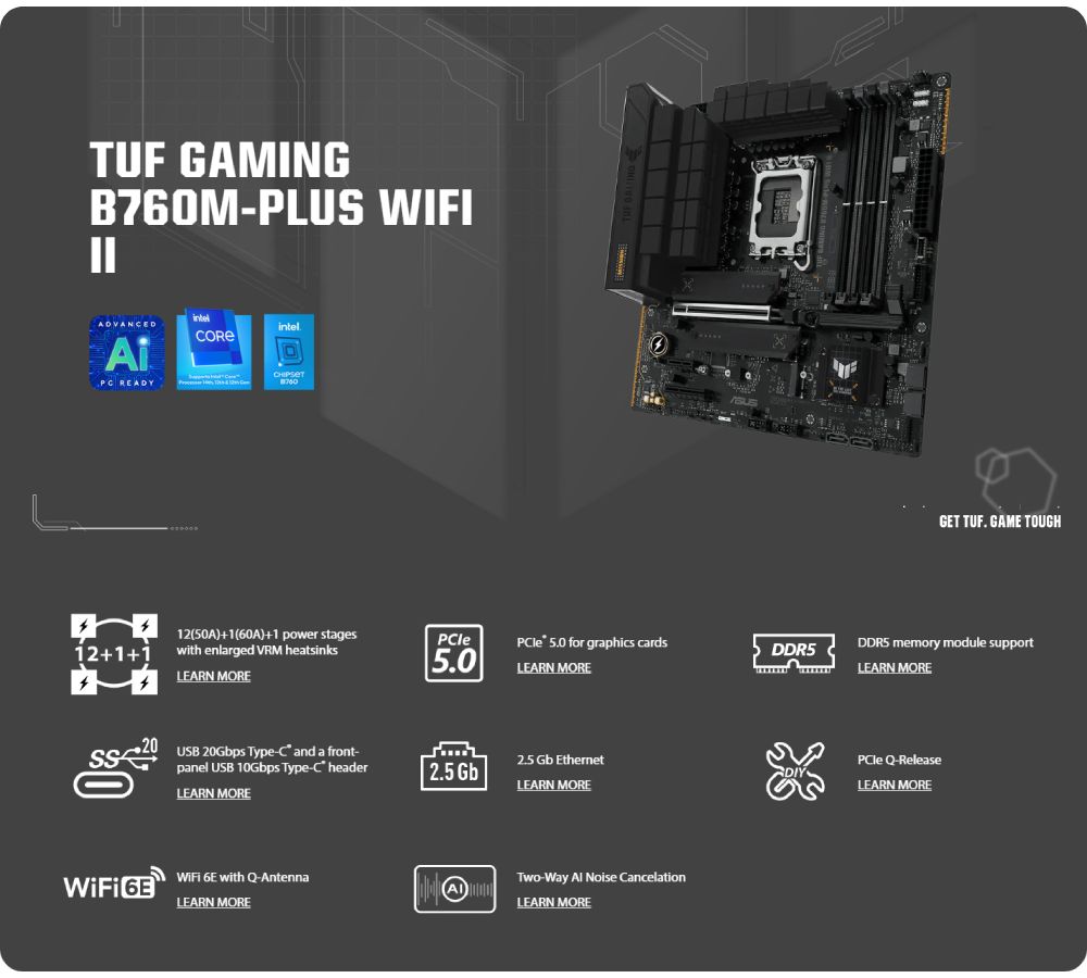 เมนบอร์ด ASUS TUF GAMING B760M-PLUS WIFI II นำเอาองค์ประกอบที่จำเป็นทั้งหมดของโปรเซสเซอร์ Intel® รุ่นล่าสุด มาผสมผสานกับคุณสมบัติที่พร้อมสำหรับการเล่นเกมและความทนทานที่พิสูจน์แล้ว เมนบอร์ดนี้ได้รับการออกแบบด้วยส่วนประกอบระดับทหาร ด้วยโซลูชันพลังงานที่อัปเกรด และระบบระบายความร้อนที่ครอบคลุม ซึ่งทำให้เหนือความคาดหมายด้วยประสิทธิภาพที่มั่นคงสำหรับการเล่นเกมแบบมาราธอน เมนบอร์ด TUF GAMING ยังผ่านการทดสอบความทนทานอย่างเข้มงวดเพื่อให้แน่ใจว่าสามารถรับมือกับสภาวะที่เมนบอร์ดอื่นๆ อาจล้มเหลวได้ ในด้านสุนทรียศาสตร์ รุ่นนี้รวมป้ายชื่อนูนและองค์ประกอบการออกแบบทางเรขาคณิตเพื่อสะท้อนถึงความน่าเชื่อถือและเสถียรภาพที่กำหนดซีรีส์ TUF GAMING แพลตฟอร์มนี้มอบพลังและการเชื่อมต่อที่แอปพลิเคชัน AI PC ขั้นสูงต้องการ