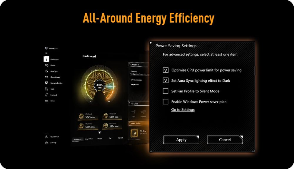 ฟังก์ชันประหยัดพลังงานมีการตั้งค่าต่างๆ มากมายที่สามารถปรับการใช้พลังงานให้เหมาะสมและประหยัดพลังงานสูงสุดได้อย่างง่ายดาย คุณสามารถเปิดใช้งานขีดจำกัดพลังงาน CPU ปรับแสง Aura ให้มืดลง และตั้งค่าโปรไฟล์พัดลมให้เป็นโหมดประหยัดพลังงานได้ นอกจากนี้ คุณยังสามารถสลับแผนประหยัดพลังงานที่ติดตั้งมาใน Microsoft Windows ได้อีกด้วย