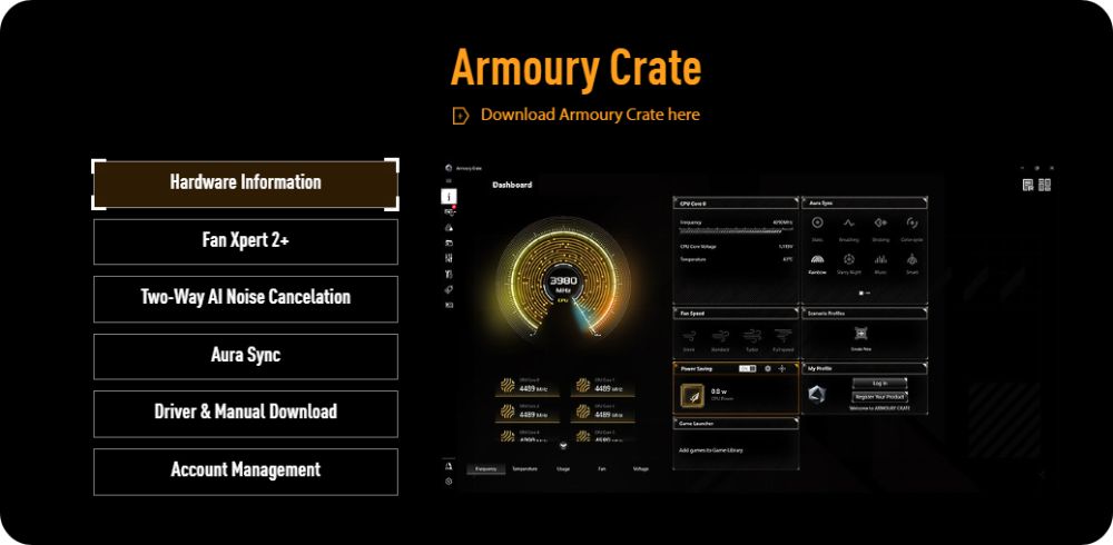 ซอฟต์แวร์ Armoury Crate ซอฟต์แวร์ที่เป็นเอกสิทธิ์เฉพาะของ ASUS ทำหน้าที่รวมศูนย์การควบคุมผลิตภัณฑ์เกมมิ่งที่รองรับทั้งหมด อินเทอร์เฟซที่ใช้งานง่ายเพียงอินเทอร์เฟซเดียวช่วยให้คุณปรับแต่งแสง RGB สำหรับอุปกรณ์ที่เข้ากันได้ทั้งหมดและเชื่อมโยงอุปกรณ์เหล่านั้นกับ Aura Sync เพื่อการส่องสว่างที่เป็นหนึ่งเดียว นอกจากนี้ยังแสดงข้อมูลจากระบบนิเวศฮาร์ดแวร์ที่กำลังเติบโต และช่วยให้ควบคุมได้ Armoury Crate ยังช่วยให้ลงทะเบียนผลิตภัณฑ์ได้ง่าย และมีส่วนข่าวเพื่อให้คุณติดตามข่าวสารจากชุมชนเกมได้