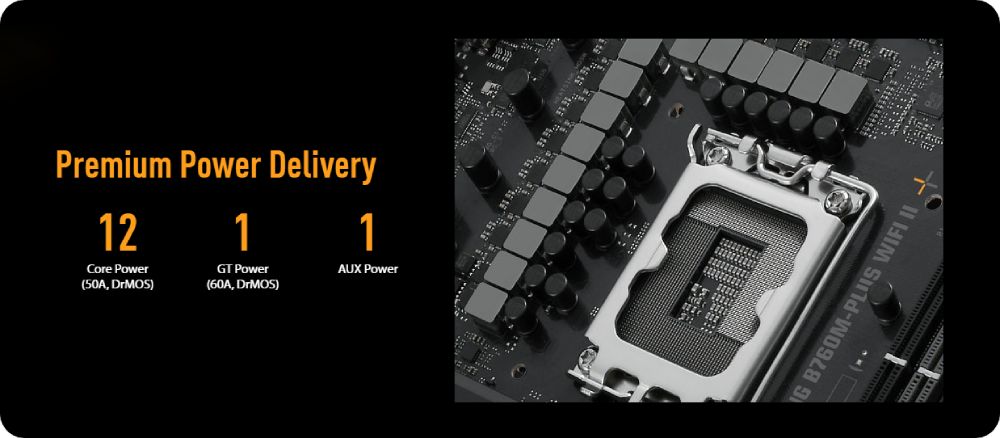 ชุดจ่ายไฟ 12+1+1 เฟส ได้รับการจัดอันดับให้รองรับกระแสไฟได้สูงสุด 50 แอมแปร์ โดยการรวม MOSFETS และไดรเวอร์ด้านสูงและด้านต่ำเข้าไว้ในแพ็คเกจเดียวเพื่อส่งมอบพลังงาน ประสิทธิภาพ และประสิทธิภาพการทำงานที่เสถียรสำหรับโปรเซสเซอร์ Intel ที่เข้ากันได้ทั้งหมด