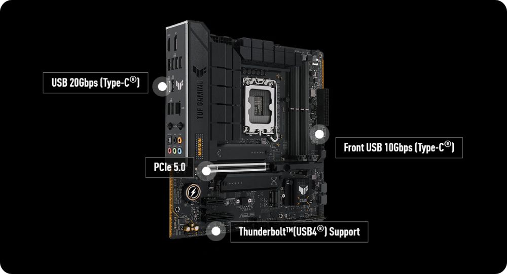 TUF-GAMING B760M-PLUS WIFI II เข้าถึงศักยภาพด้านประสิทธิภาพขั้นสูงสุดด้วย PCI Express เวอร์ชันล่าสุด ในขณะที่พอร์ต USB มากมายรวมถึงการเชื่อมต่อ Type-C สองพอร์ต และ Thunderbolt 4 ยังขยายความเข้ากันได้และแบนด์วิดท์ให้กว้างขึ้นอีกด้วย