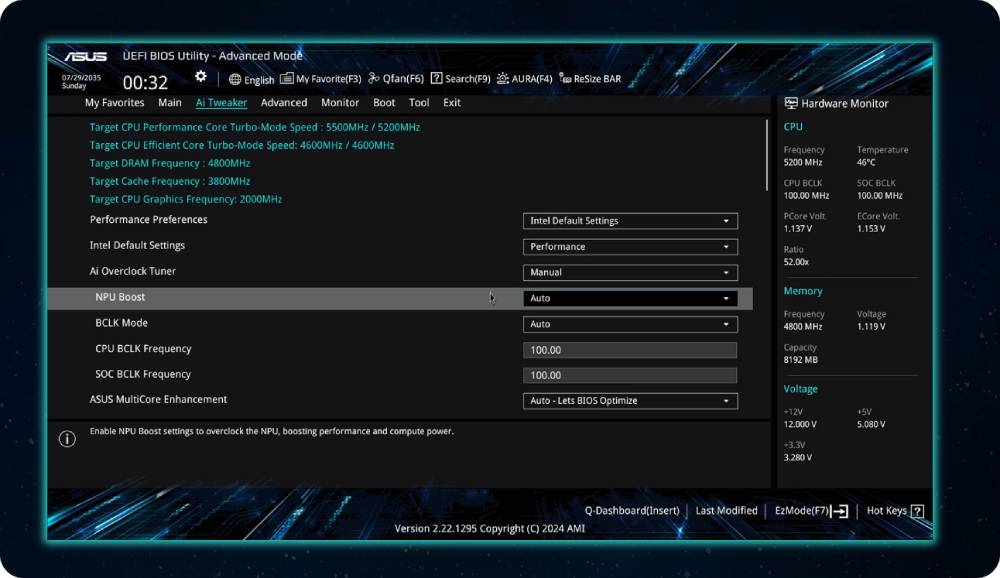 NPU ที่ผสานรวมในโปรเซสเซอร์ Intel® Core™ Ultra (Series 2) ช่วยเร่งความเร็วเวิร์กโฟลว์ AI ได้อย่างมีประสิทธิภาพ และ NPU Boost ช่วยให้คุณทำอะไรได้มากขึ้นด้วยคุณสมบัติดังกล่าว ฟีเจอร์ BIOS นี้จะโอเวอร์คล็อก NPU ด้วยการคลิกเพียงครั้งเดียว เพิ่มประสิทธิภาพได้สูงสุดถึง 24%