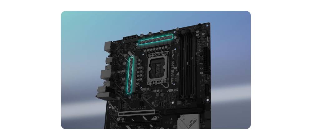 พลังงานที่เสถียรเป็นสิ่งสำคัญสำหรับการเพิ่มประสิทธิภาพของโปรเซสเซอร์ Intel® Core™ Ultra (Series 2) ทำให้เมนบอร์โ PRIME Z890-P WIFI-CSM ได้รับการออกแบบมาเพื่อตอบสนองความต้องการของ CPU ที่มีจำนวนคอร์สูง โดยมีขั้นตอนพลังงาน 14(80A) + 1(80A) + 2(80A) + 1(80A) ที่ผสาน MOSFET และไดรเวอร์ด้านสูงและด้านต่ำเข้าไว้ในแพ็คเกจที่สามารถรองรับกระแสไฟได้สูงสุดถึง 80 แอมแปร์ต่อแพ็คเกจ การกำหนดค่านี้ช่วยให้จ่ายพลังงานได้อย่างมีประสิทธิภาพ มีเสถียรภาพ และทำงานได้อย่างมีประสิทธิภาพสำหรับโปรเซสเซอร์ Intel® ทั้งในปัจจุบันและอนาคต