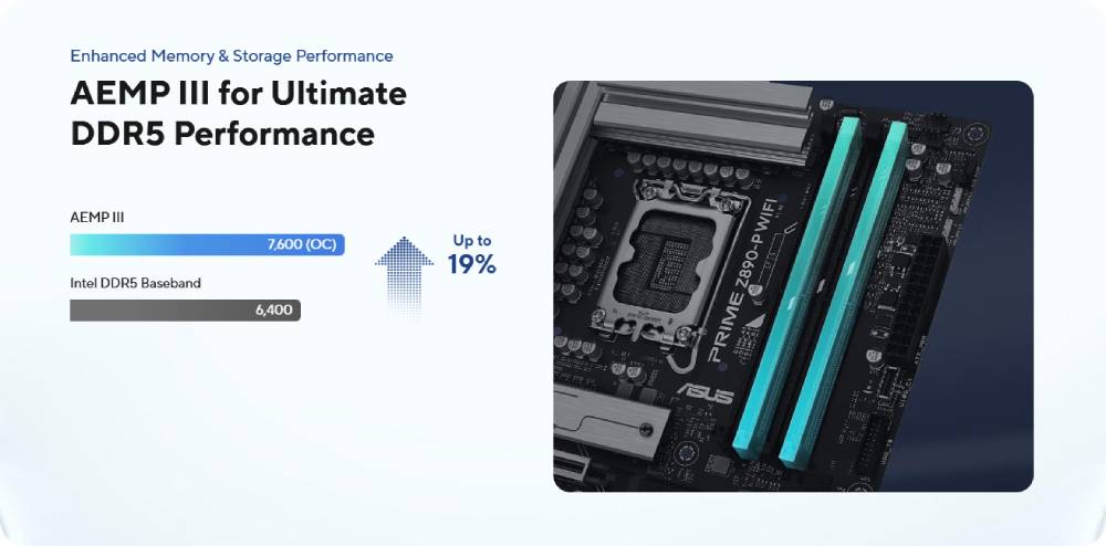 ASUS Enhanced Memory Profile III (AEMP III) เป็นฟีเจอร์เฟิร์มแวร์ขั้นสูงที่ช่วยให้ผู้ใช้สามารถใช้งานหน่วยความจำ CUDIMM ที่มีประสิทธิภาพเหนือใครได้ โดยผ่านกระบวนการปรับแต่งที่ครอบคลุมสองเฟส AEMP III จะปรับแต่งไดรเวอร์สัญญาณนาฬิกาก่อน จากนั้นจึงปรับแต่งความถี่หน่วยความจำ ส่งผลให้มีสมดุลที่ดีที่สุดระหว่างประสิทธิภาพและความเสถียร แม้จะใช้ความเร็ว DDR5-7600 หรือสูงกว่าที่ล้ำสมัย