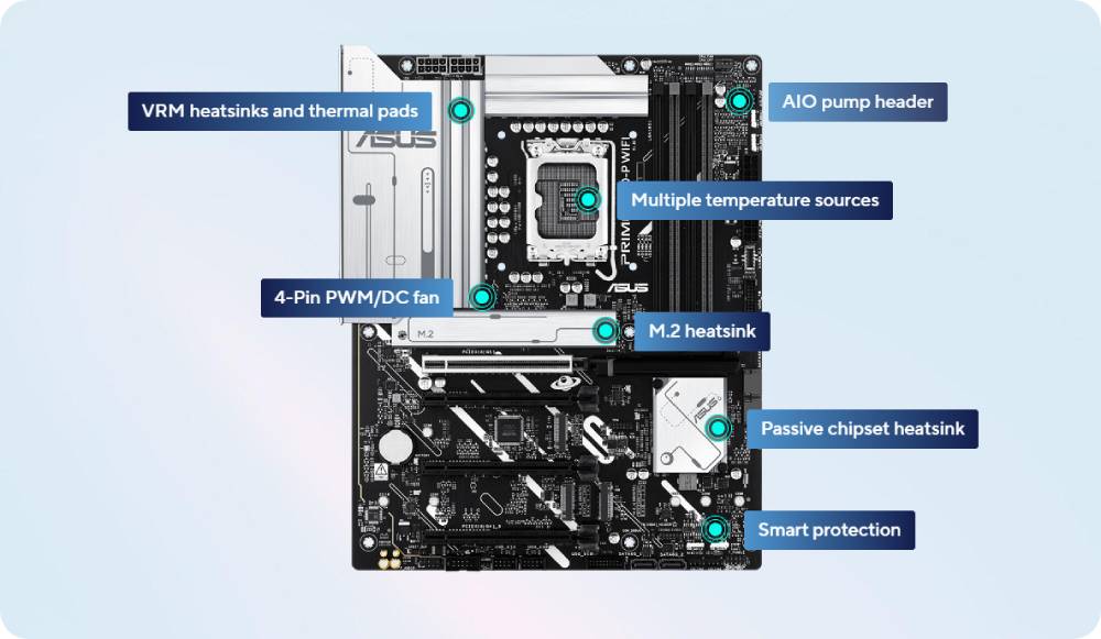 มาเธอร์บอร์ด PRIME Z890-P WIFI-CSM ได้รับการออกแบบด้วยฮีทซิงก์ออนบอร์ดหลายตัวและหัวต่อพัดลมไฮบริดจำนวนมากเพื่อช่วยให้แน่ใจว่าเครื่องของคุณเย็นและเสถียรภายใต้ภาระงานหนัก