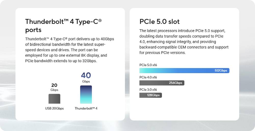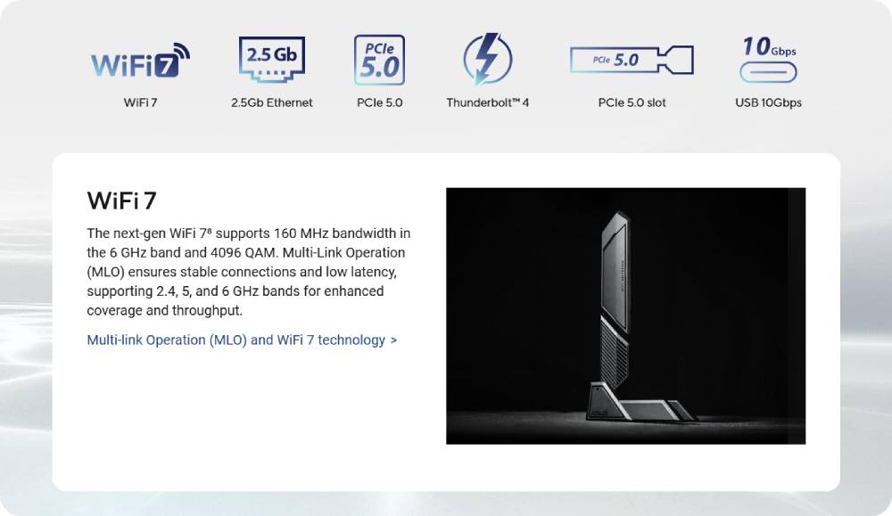 เมนบอร์ด PRIME Z890-P WIFI-CSM มอบการเชื่อมต่อที่หลากหลาย รวมถึงการรองรับ WiFi 7 ซึ่งเป็น PCI Express เวอร์ชันล่าสุด ในขณะที่พอร์ต USB มากมายรวมถึงการเชื่อมต่อ Type-C และ Thunderbolt™ 4 ซึ่งขยายความเข้ากันได้และแบนด์วิดท์ให้กว้างขึ้นอีกด้วย