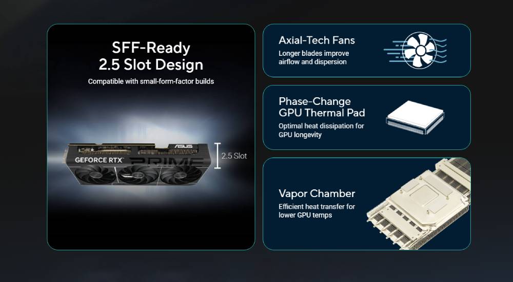 Prime GeForce RTX 5080 มาพร้อมกับการออกแบบช่องขนาด 2.5 ช่องพร้อมการจัดวางที่จัดวางอย่างพิถีพิถันสำหรับแผ่นปิด แผ่นระบายความร้อน และท่อระบายความร้อนเพื่อให้พัดลม Axial-tech จำนวน 3 ตัวใช้ประโยชน์จากการระบายอากาศที่แผงด้านข้างตัวเครื่องและส่งมอบประสิทธิภาพความร้อน ที่เหมาะสมที่สุด