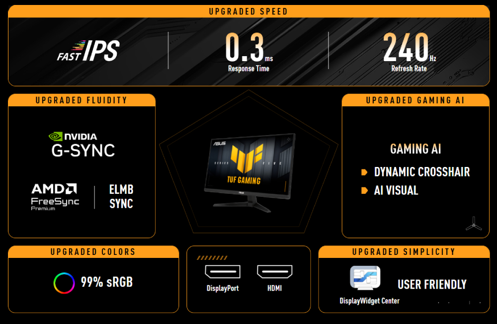 จอภาพนี้มาพร้อมอัตราการรีเฟรชที่รวดเร็วถึง 240Hz และเวลาตอบสนอง 0.3ms พร้อมด้วย AMD FreeSync Premium และ NVIDIA G-SYNC สำหรับการเล่นเกมที่ราบรื่นเป็นพิเศษ ด้วยประสิทธิภาพสีที่ได้รับการปรับปรุง Gaming AI ที่ได้รับการอัปเดต และการควบคุมที่ง่ายดายผ่าน DisplayWidget Center จอภาพนี้ช่วยให้คุณก้าวล้ำหน้าคู่แข่ง
