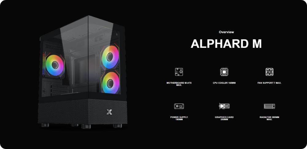 เคส Xigmatek Alphard M ผสมผสานความสง่างามและความกะทัดรัดเข้าด้วยกัน เคสนี้จะช่วยอวดส่วนประกอบต่างๆ ของคุณได้ดีที่สุดด้วยแผงกระจกนิรภัยด้านหน้าและด้านข้าง เคสพีซี Mini Tower นี้ติดตั้งพัดลม ARGB ขนาด 120 มม. จำนวน 4 ตัว และสามารถรองรับการ์ดกราฟิกขนาด 350 มม. ได้ จึงมอบสภาพแวดล้อมที่เหมาะสมที่สุดสำหรับการออกแบบเครื่องขนาดกะทัดรัดสำหรับการเล่นเกมโดยเฉพาะ