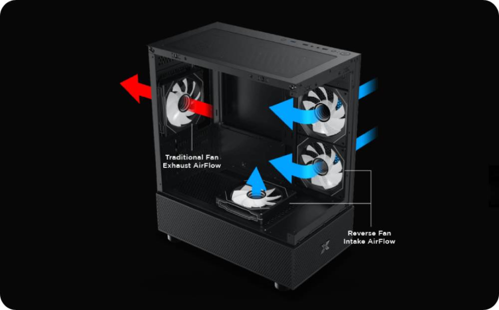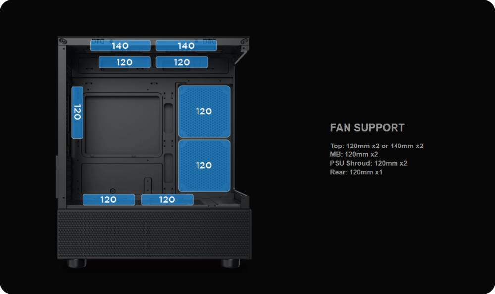 - ชุดระบายความร้อนด้วยน้ำ: รองรับหม้อน้ำ (radiator) ขนาด 240/280 มม. ที่ด้านบน และ 120 มม. ที่ด้านหลัง.