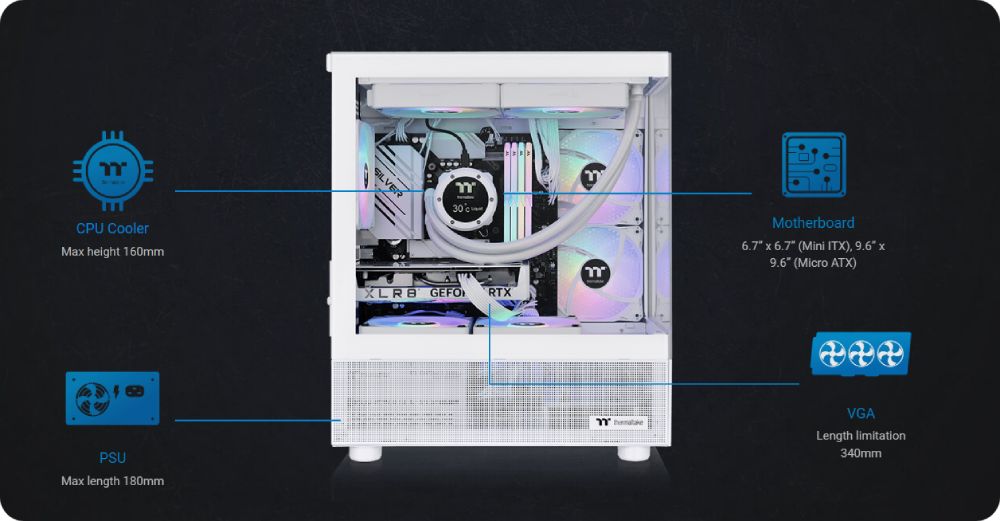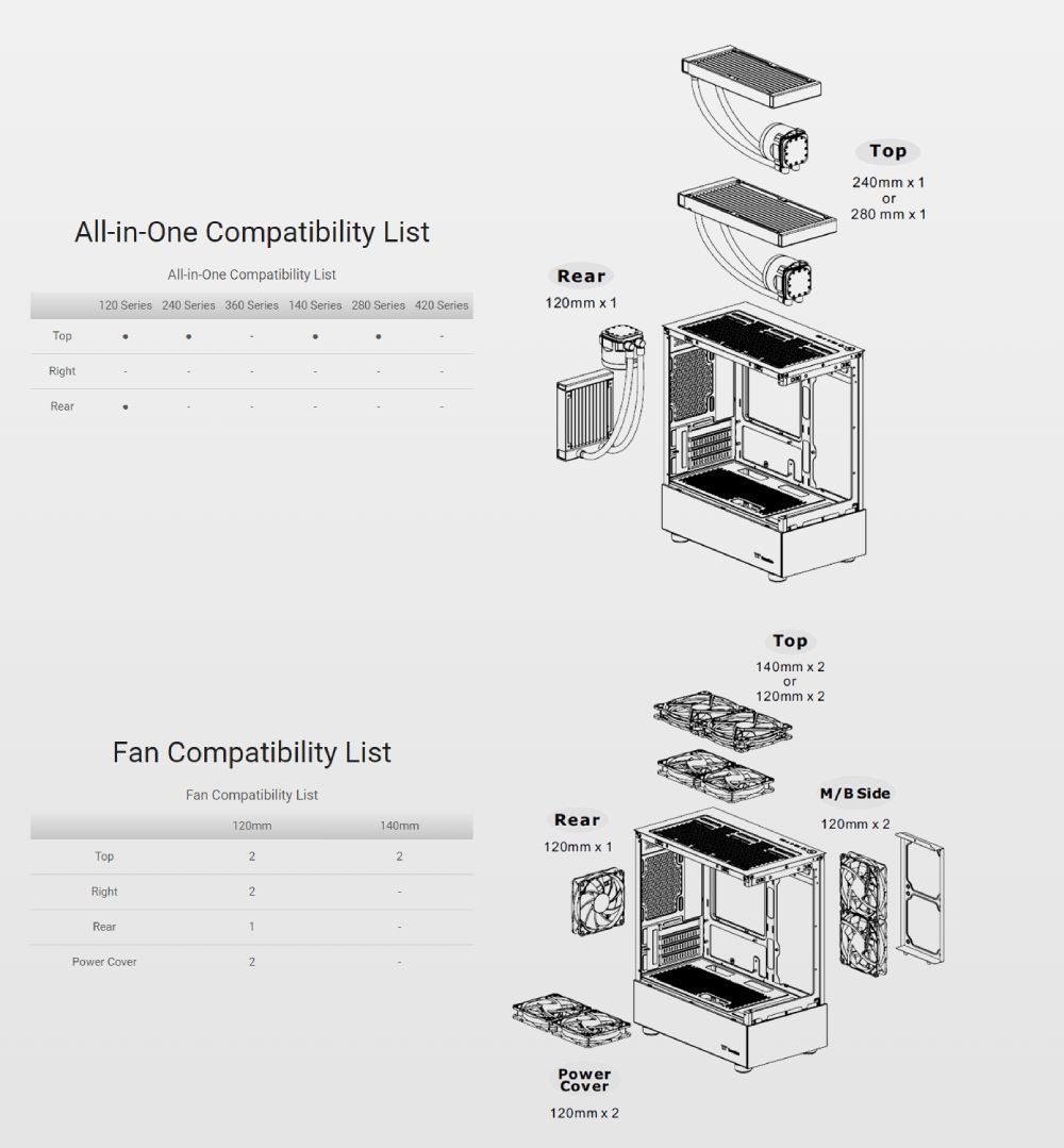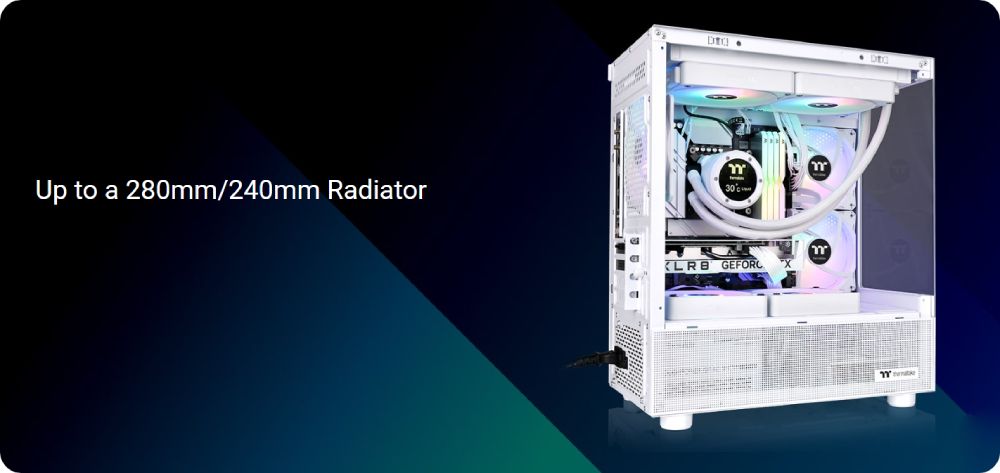 เพื่อให้รองรับการระบายความร้อนได้ดี ผู้ใช้สามารถเลือกที่จะวางชุดหม้อน้ำขนาด 280 มม./240 มม. ไว้ที่ด้านบนของ View 170 TG ARGB Micro Chassis
