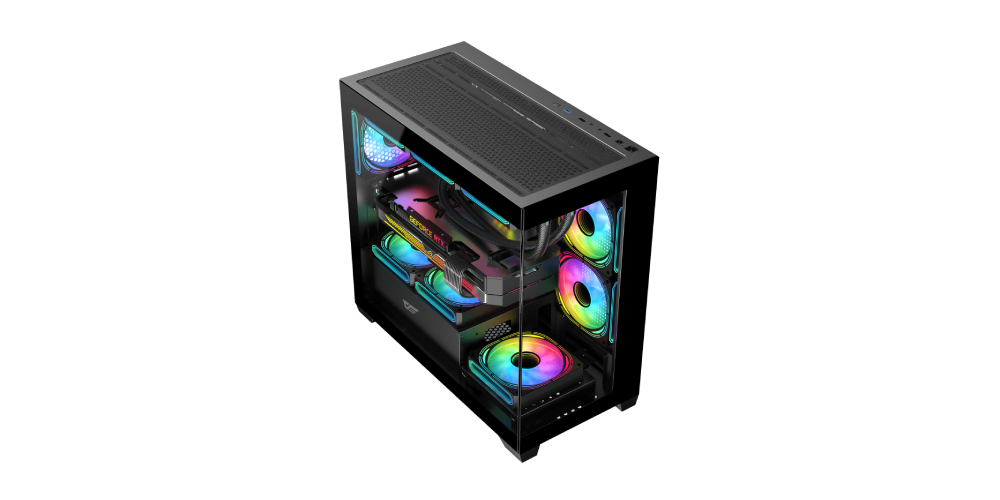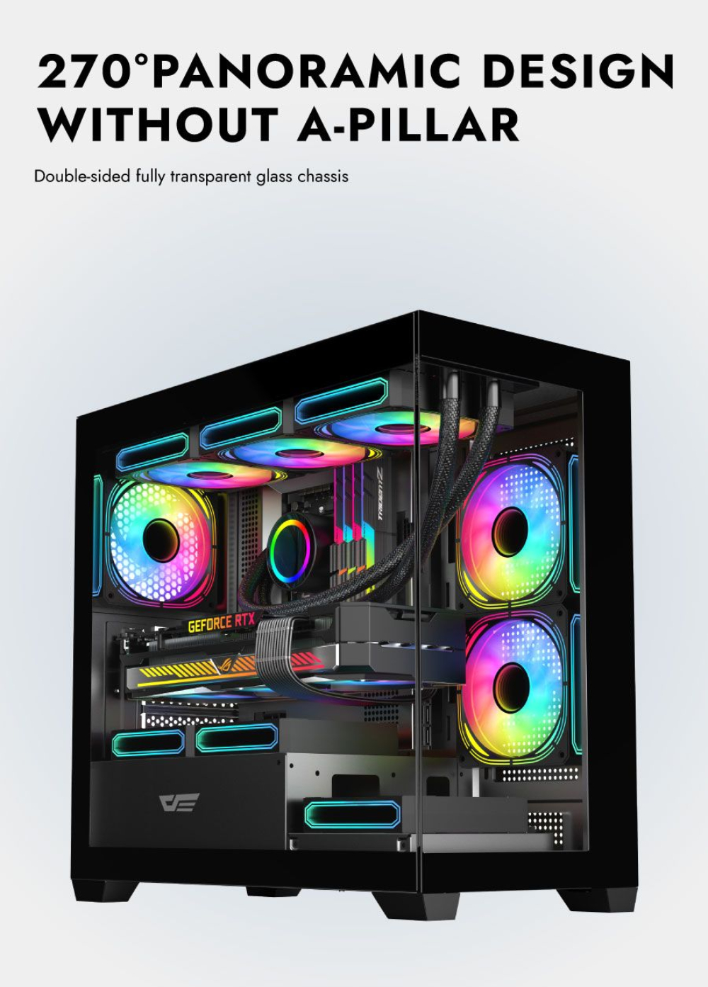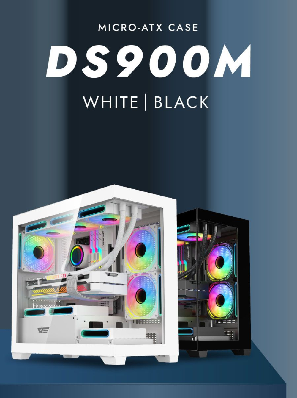 เคส DARKFLASH DS900M M-ATX PC Case พร้อม DarkFlash DM20 12CM ARGB Cooling Fan 3 ตัว เป็นตัวเลือกที่น่าสนใจสำหรับผู้ที่ต้องการเคสคอมพิวเตอร์ขนาดเล็กแต่มีดีไซน์ที่โดดเด่นไม่เหมือนใคร ด้วยดีไซน์การออกแบบพาโนรามา 270 องศา แบบตู้ปลาไร้ขอบที่โชว์ส่วนประกอบภายในได้เต็มที่ พร้อมการรองรับอุปกรณ์ประสิทธิภาพสูงและการจัดการระบายความร้อนที่ดีเยี่ยม ทำให้เป็นเคสที่ตอบโจทย์ทั้งในด้านความสวยงามและการใช้งานจริงในราคาที่คุ้มค่า