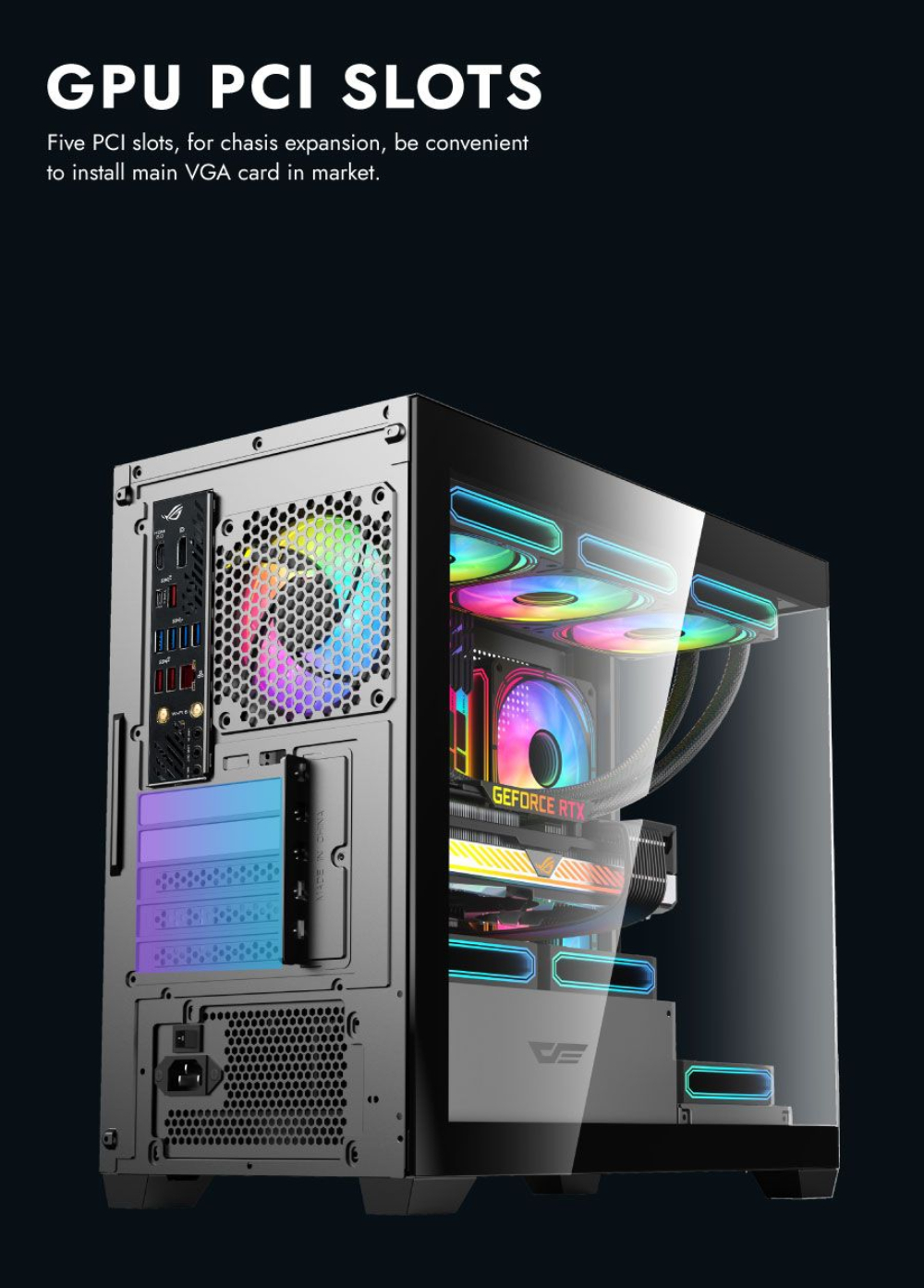 - รองรับการ์ดจอขนาดใหญ่: สามารถรองรับการ์ดจอที่มีความยาวสูงสุดถึง 425 มม. ซึ่งเพียงพอสำหรับ RTX การ์ดจอระดับสูงส่วนใหญ่ในปัจจุบัน