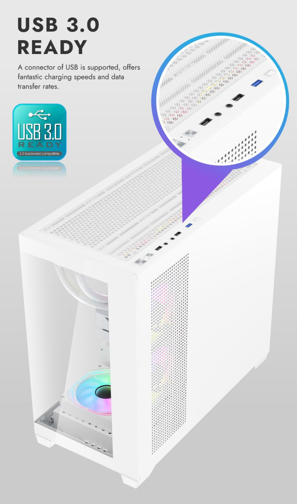 - กระจกนิรภัยด้านหน้าและด้านข้าง: เป็นจุดเด่นที่สำคัญที่สุดของเคสนี้ ทำให้สามารถโชว์ส่วนประกอบภายในเครื่องได้อย่างเต็มที่ ไม่ว่าจะเป็นการ์ดจอ, ชุดระบายความร้อน, หรือไฟ RGB ที่ติดตั้งไว้