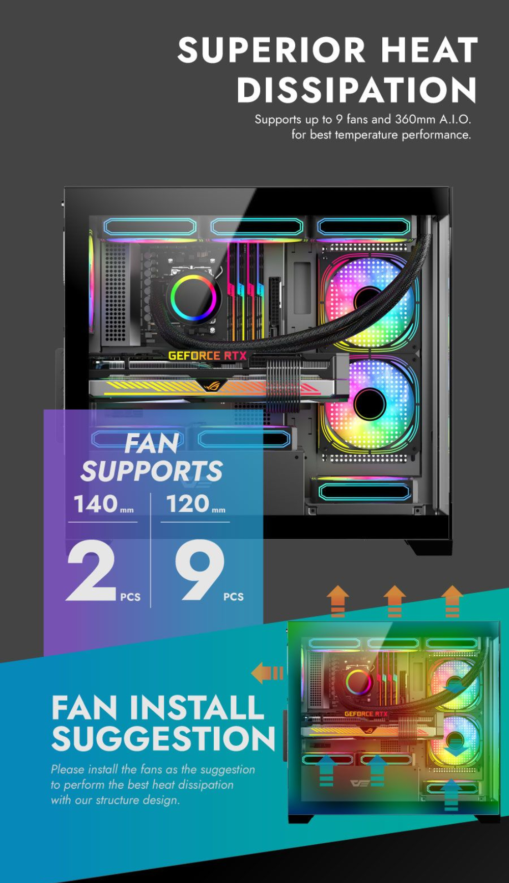 - รองรับพัดลมสูงสุด 9 ตัวและชุดหม้อน้ำขนาด 360 มม.