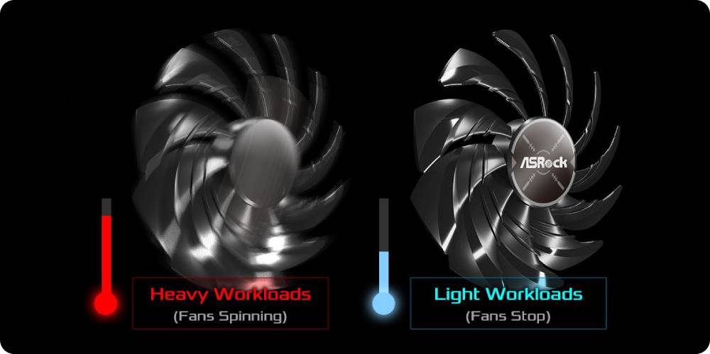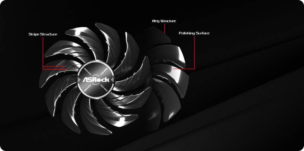 พัดลมแกน Striped เฉพาะของ ASRock มอบการไหลเวียนของอากาศที่ดีขึ้นเพื่อเพิ่มประสิทธิภาพการระบายความร้อนไม่เพียงจากโครงสร้างแถบบนใบพัดลมแต่ละใบเท่านั้น แต่ยังรวมถึงพื้นผิวขัดเงาที่ด้านล่างอีกด้วย