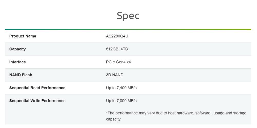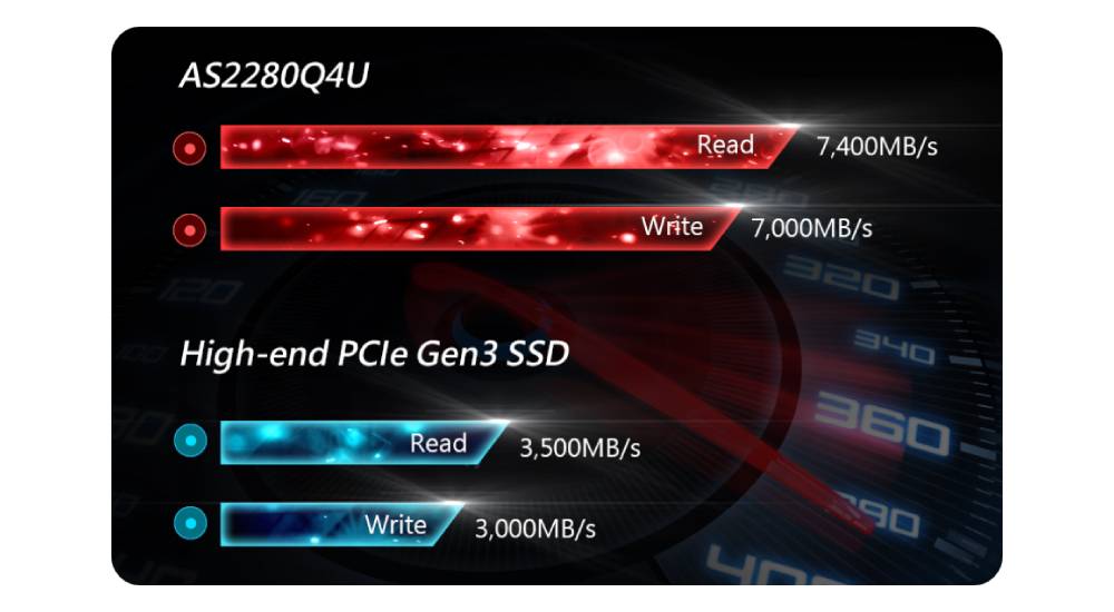 อินเทอร์เฟซ PCIe Gen4 x4 ที่รวดเร็วของ AS2280Q4U เป็นไปตามมาตรฐาน NVMe 1.4 อย่างสมบูรณ์ โดยมีประสิทธิภาพการอ่าน/เขียนแบบต่อเนื่องสูงถึง 7,400/7,000 MB/s เร็วกว่า SSD Gen3 ถึงสองเท่า และเร็วกว่า SSD SATA ถึง 15 เท่า จึงมอบประสิทธิภาพที่ไม่มีใครเทียบได้สำหรับเกมเมอร์และผู้สร้างวิดีโอ