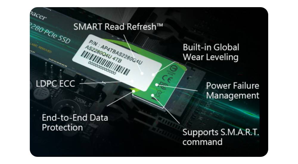 เพื่อให้ผู้ใช้ได้รับประสบการณ์ความเร็วสูงที่ไร้ที่ติ AS2280Q4U จึงมีเทคโนโลยีการป้องกันในตัวจำนวนหนึ่ง การแคช SLC เป็นเทคโนโลยีที่ออกแบบมาเพื่อให้แน่ใจว่าข้อมูลจะถูกจัดเก็บอย่างถูกต้องและเสถียร ด้วยเทคโนโลยีการปรับระดับการสึกหรอขั้นสูงในตัวและฟังก์ชันแก้ไขข้อผิดพลาดอัตโนมัติ จึงไม่เพียงแต่ขยายอายุการใช้งานของ SSD และปรับปรุงเสถียรภาพในการทำงานเท่านั้น แต่ยังช่วยให้มั่นใจได้ว่าผลิตภัณฑ์จะรักษาประสิทธิภาพที่สม่ำเสมอหลังจากใช้งานในระยะยาวอีกด้วย