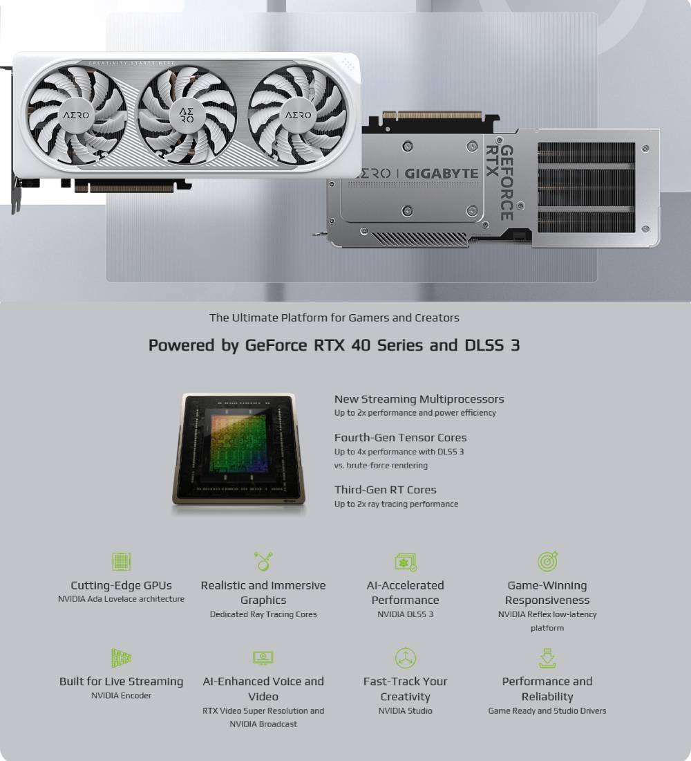 การ์ดจอ Gigabyte GeForce RTX 4060 Ti AERO OC 8GB ขับเคลื่อนด้วย NVIDIA DLSS 3, Ada Lovelace arch ที่มีประสิทธิภาพสูงสุด และ Ray Tracing เต็มรูปแบบ ผสานกับอินเทอร์เฟซหน่วยความจำ 8GB GDDR6 128-bit ระบบระบายความร้อน WINDFORCE มีพัดลมใบพัดเฉพาะขนาด 80 มม. จำนวน 3 ตัว การหมุนสลับกัน ท่อระบายความร้อนทองแดงคอมโพสิต 4 ท่อสัมผัสกับ GPU โดยตรง พัดลม 3D Active และระบบระบายความร้อนหน้าจอ ซึ่งรวมกันให้การระบายความร้อนที่มีประสิทธิภาพสูง