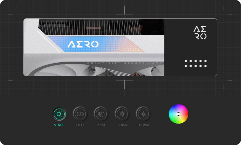 ด้วยตัวเลือกสีที่ปรับแต่งได้ถึง 16.7 ล้านสีและเอฟเฟกต์แสงจำนวนมาก คุณสามารถเลือกเอฟเฟกต์แสงใดๆ ก็ได้หรือซิงโครไนซ์กับอุปกรณ์อื่นใน GIGABYTE CONTROL CENTER