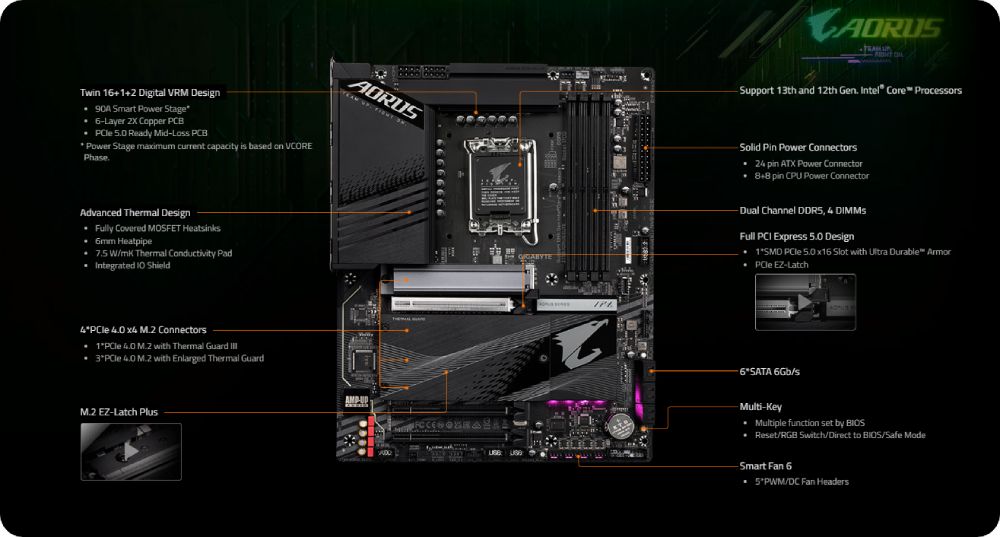 - EZ-Latch Plus: สล็อต PCIe 5.0 x16 และขั้วต่อ M.2 พร้อมการปลดอย่างรวดเร็วและการออกแบบแบบไร้สกรู