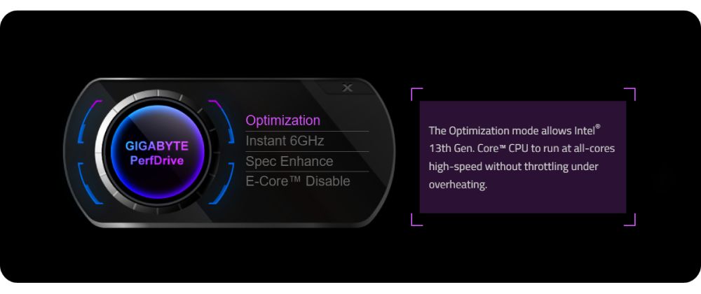 เทคโนโลยี PerfDrive ผสานรวมการตั้งค่า BIOS พิเศษของ GIGABYTE หลายรายการเพื่อให้ผู้ใช้สามารถปรับสมดุลระหว่างระดับประสิทธิภาพ การใช้พลังงาน และอุณหภูมิที่แตกต่างกันตามความต้องการได้อย่างง่ายดายเมื่อใช้โปรเซสเซอร์ Intel® Core™ เจนเนอเรชั่นที่ 14