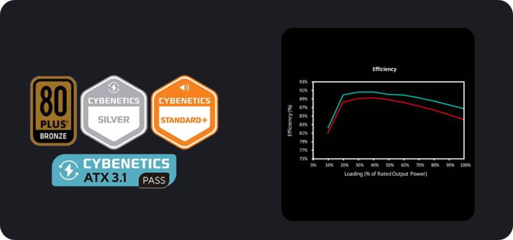 สอดคล้องกับ ATX 3.1 เพื่อรองรับพลังงานสูงสุดที่สูงกว่าวัตต์สูงสุดที่กำหนดไว้ 1.5 เท่า หน่วยนี้เหมาะอย่างยิ่งสำหรับการใช้งานกับ GPU 40-Series