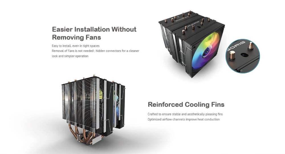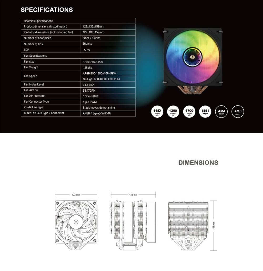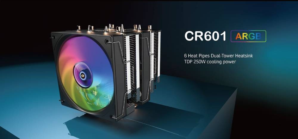 พัดลมซีพียู CRYORIG CR601 A-RGB คุณภาพวัสดุพรีเมี่ยมที่มอบประสิทธิภาพในการระบายความร้อนที่โดดเด่นผ่านการระบายความร้อนด้วย Heatpipe 6 เส้น และพัดลม 1800 rpm 2 ตัว รวมทั้งครอบคลุมซ็อกเก็ต CPU Intel LGA115X LGA1200 LGA1700 LGA1851 และ AMD AM4 AM5 ออกแบบมาให้ความสูงกำลังพอดีติดตั้งได้ง่าย ประกอบได้ง่ายมีช่องให้ไขควงใส่ไปเพื่อการติดตั้งที่สะดวกสบาย เพิ่มประสิทธิภาพสูงสุด สร้างขึ้นเพื่อให้แน่ใจว่าครีบมีความเสถียรและสวยงาม มีช่องไหลเวียนของอากาศที่เหมาะสม และช่วยลดการนำความร้อนได้ดี