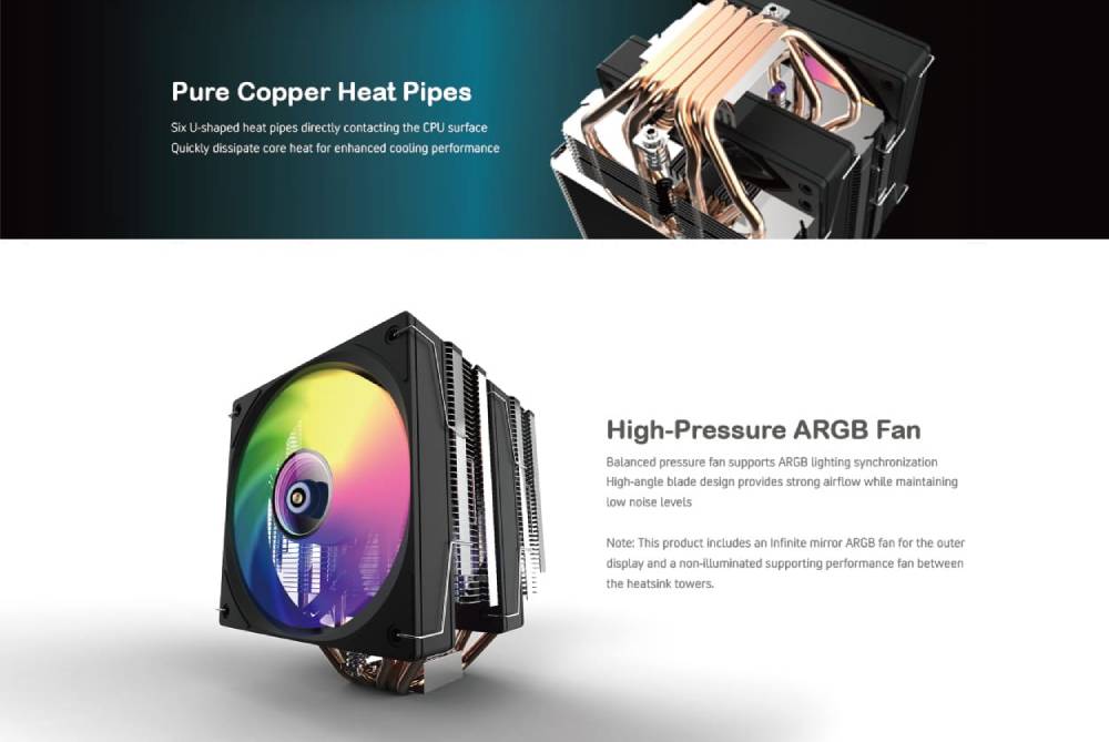 หมายเหตุ: ผลิตภัณฑ์นี้ประกอบด้วยพัดลม ARGB แบบกระจก Infinite สำหรับจอแสดงผลด้านนอกและพัดลมรองรับประสิทธิภาพแบบไม่รับแสงระหว่างหอคอยฮีทซิงค์