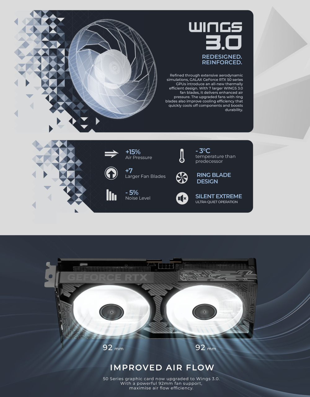 NVIDIA GALAX GeForce RTX 5060 Ti 1-Click OC เข้าร่วมตระกูล GeForce RTX 50 Series และขึ้นเวทีในฐานะสมาชิกใหม่ล่าสุดของกลุ่มผลิตภัณฑ์ใหม่ล่าสุด ด้วยท่อระบายความร้อนขนาด 3*6 มม. และพัดลม WINGS 3.0 จำนวน 2 ตัวขนาด 92 มม. ที่ช่วยระบายความร้อนของการ์ดจอได้อย่างมีประสิทธิภาพ GPU ได้รับการปรับให้เหมาะสมเพื่อทำงานที่อุณหภูมิที่เหมาะสมเพื่อประสิทธิภาพ AI สูงสุดที่ต่อเนื่อง ช่วยให้ผู้ใช้สามารถใช้ประโยชน์จากพลังอันล้ำสมัยของสถาปัตยกรรม Blackwell ใหม่ล่าสุดของ NVIDIA