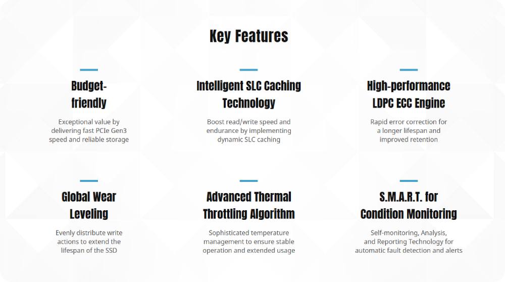 รองรับปริมาณงานหนัก การควบคุมความร้อนช่วยให้การทำงานราบรื่น โดยตรวจสอบสุขภาพของอุปกรณ์ตามหลัก SMART อายุการใช้งานสูงสุดด้วยการปรับระดับการสึกหรอทั่วไปที่กระจายข้อมูลอย่างเท่าเทียมกัน